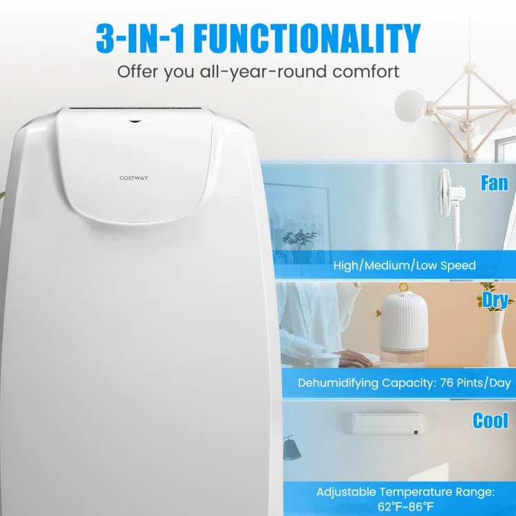 3-in-1 Function: This portable air conditioner is equipped with 3 operating modes (cool, dry and fan) and 3 fan speeds (low, medium and high) to provide you with year-round comfort. Temperature is adjustable between 62°F and 86°F. With dual controls, settings can be adjusted via the top control panel and the remote.