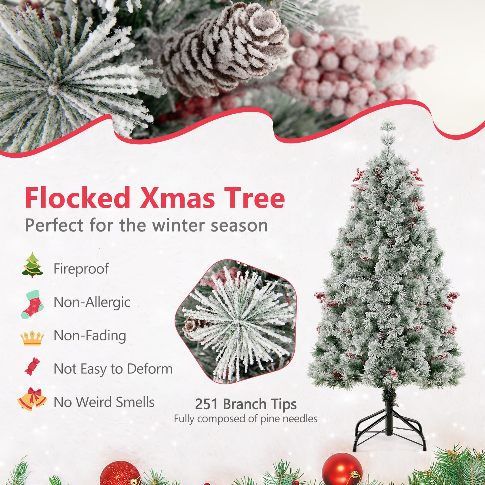 - Snowy Pine Needles🎄: Create a magical winter wonderland with the 140cm flocked Xmas tree, which contains up to 251 branch tips & fully consists of vivid pine needles. It is crafted of 100% new PVC, so resistance to fire, fading & allergies can be well ensured.