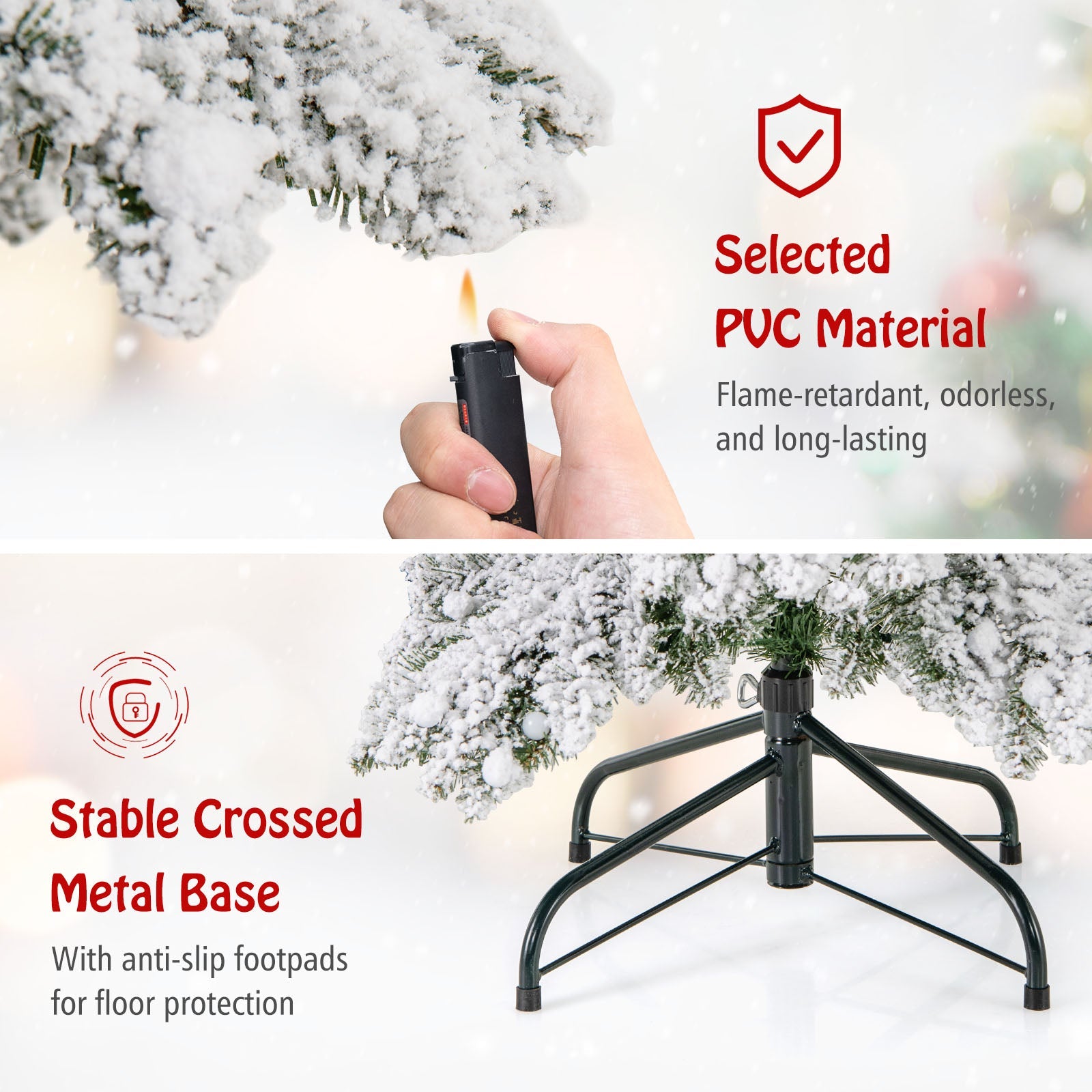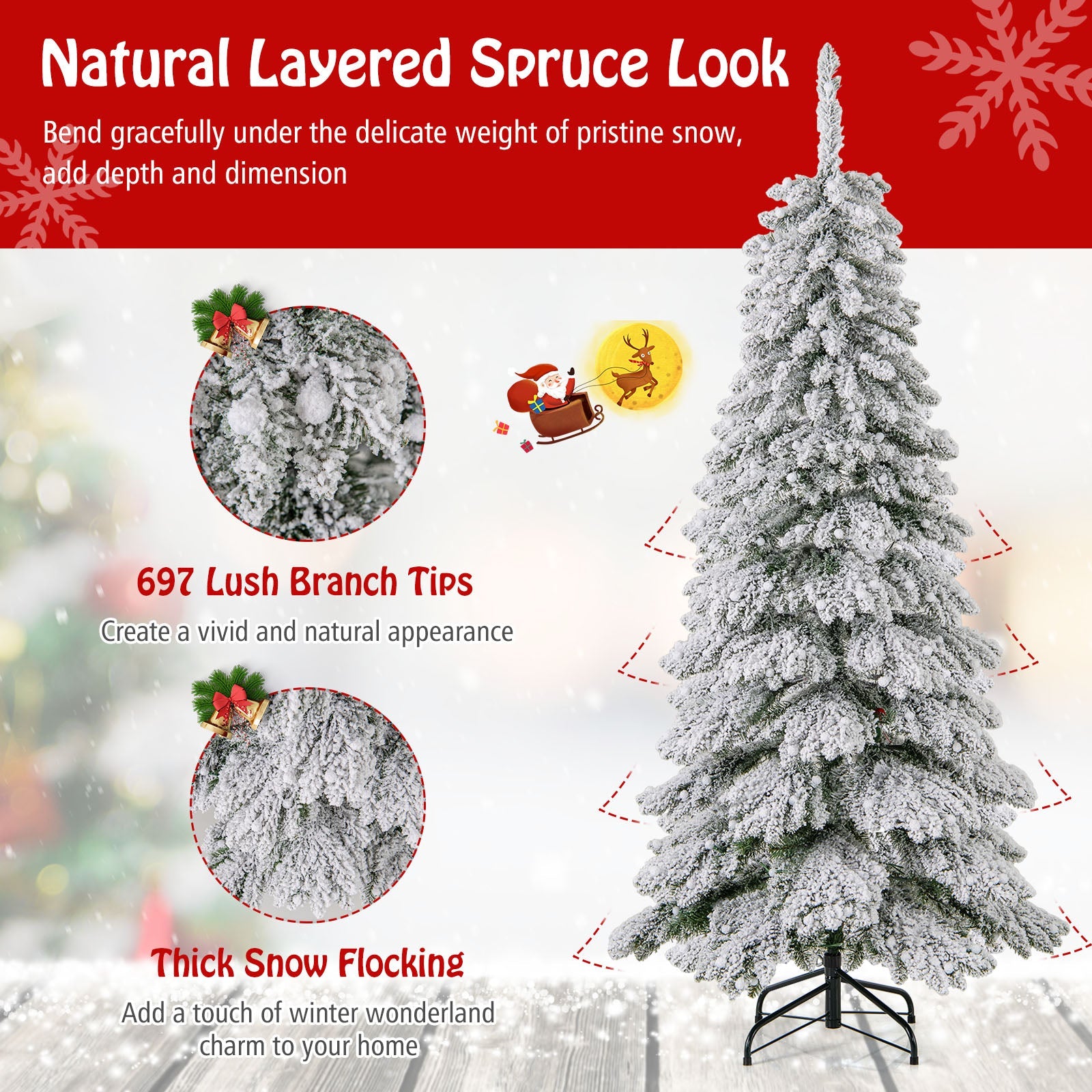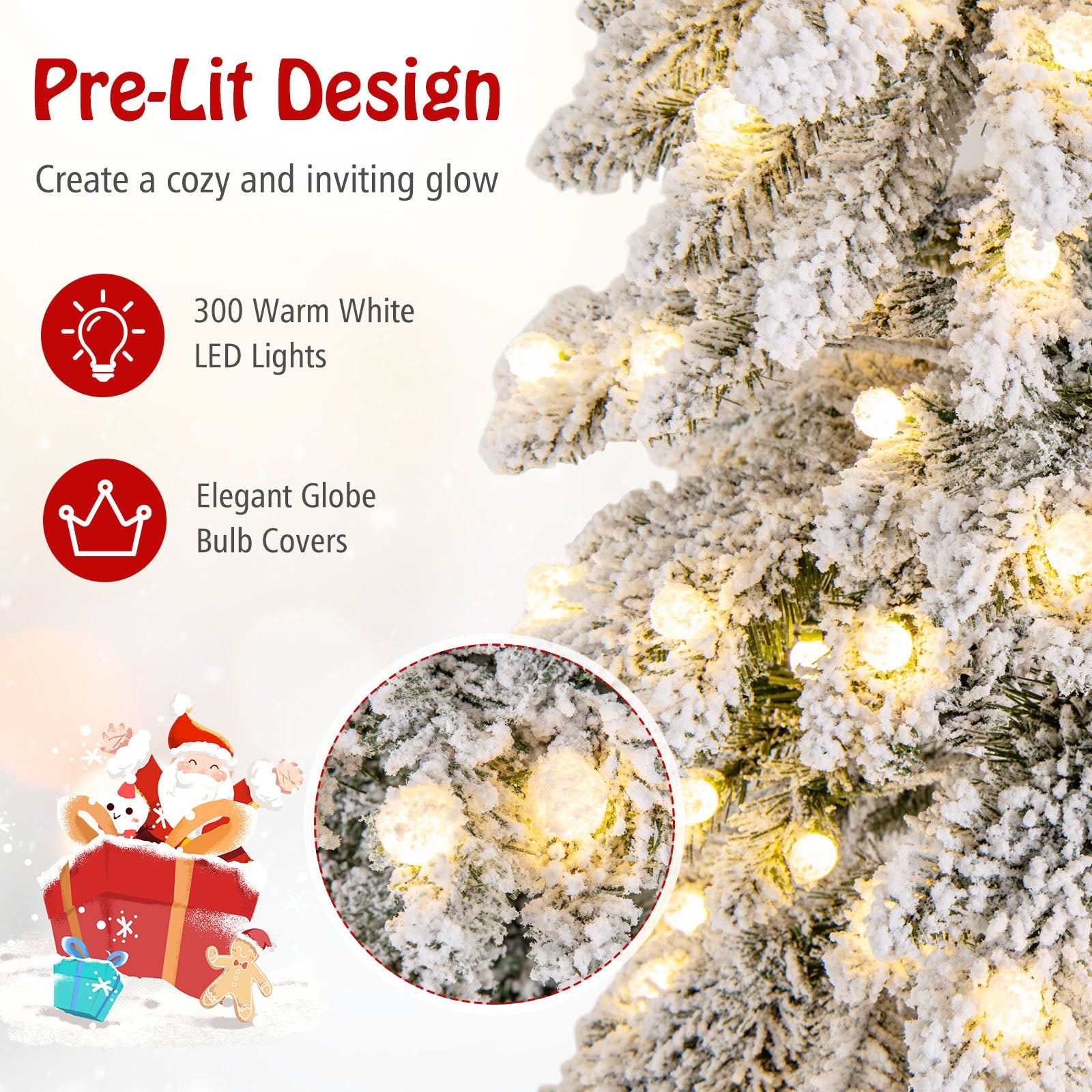 Boasts 697 full-bodied branch tips, create a vivid and natural appearanceFeatures thick snow flocking, add a touch of winter wonderland charm to your homeThe branch tips meticulously arranged, capture the essence of a natural spruce treePre-strung with warm white LED lights, create a cozy and inviting glowThe globe bulb covers add a touch of refinement to the tree's overall aestheticFeatures 3 lighting modes (steady on/flash/slow fade) and 4 brightness levels (100%/75%/50%/25%)The timer function turns the lights on for 6 hours and off for 18 hours3 modes with memory function ensure that your chosen light mode is savedProvides dual controlling ways: a remote control and an on-tree controllerThe tree adopts a convenient 3-section design, easy to set up and take downThe hinges allow branches to automatically spread out, save time and effortComes with a pre-assembled screw, no need for hole alignment, easy to secureIncludes 2 pairs of gloves to protect your hands when installing the treeAdopts premium PVC leaves, flame-retardant, odorless, and long-lastingAdopts a crossed metal base, provide strong support, not easy to wobbleThe bottom of the metal base is equipped with anti-slip footpads for floor protectionBring joy and warmth to various occasions: home, office, store, school, party, etc