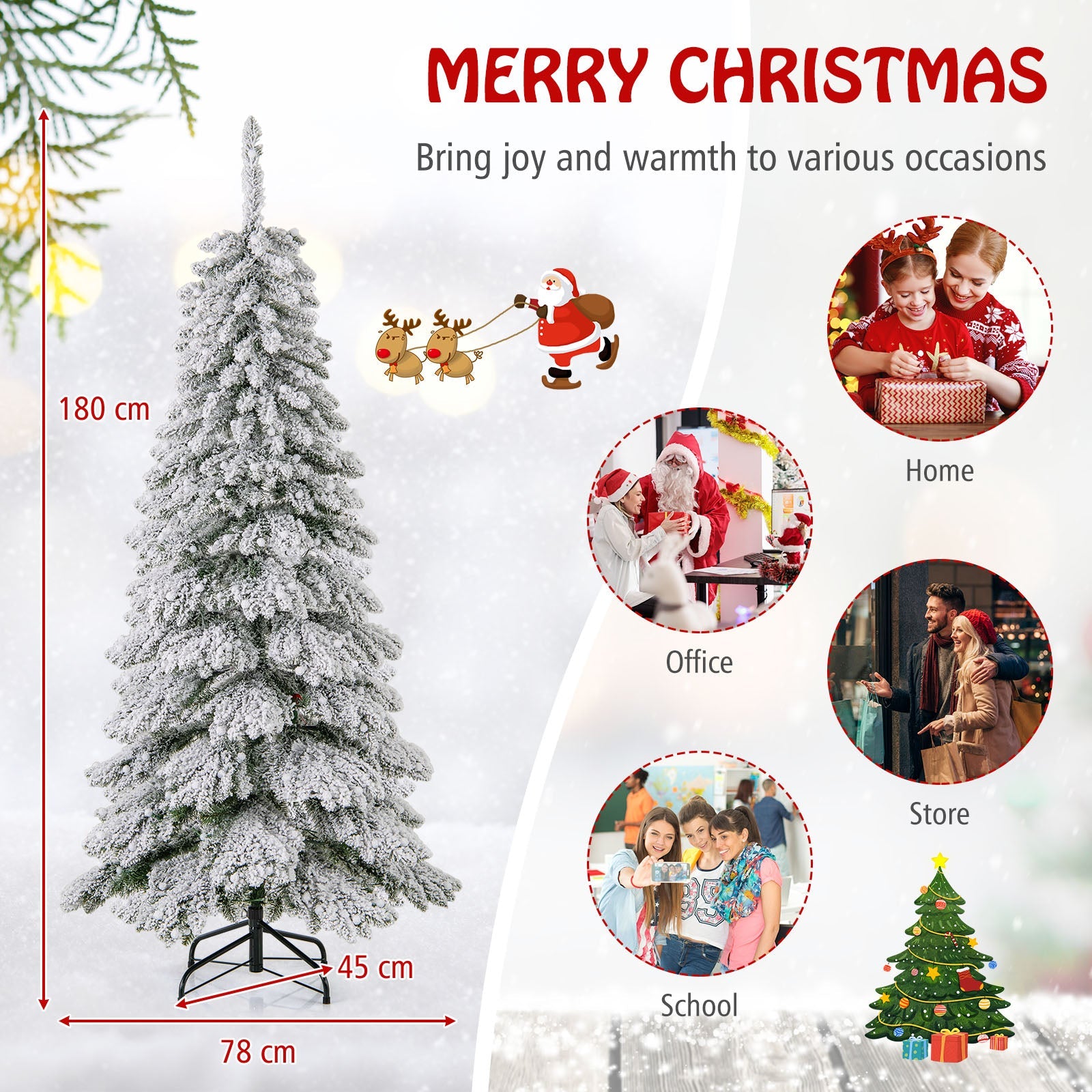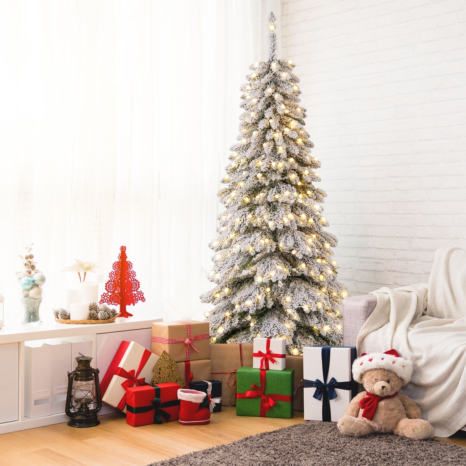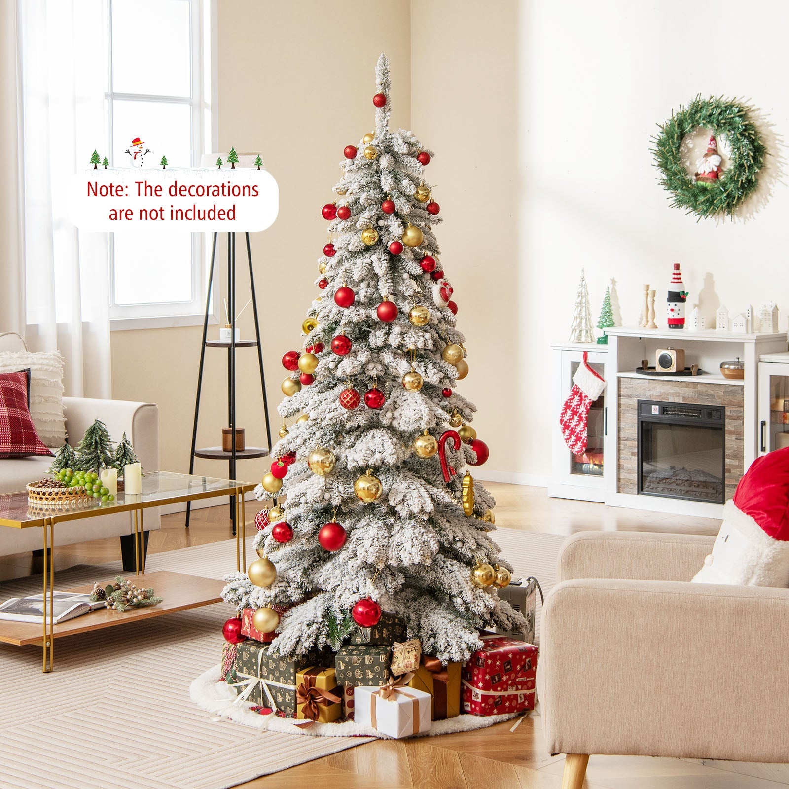 Boasts 697 full-bodied branch tips, create a vivid and natural appearanceFeatures thick snow flocking, add a touch of winter wonderland charm to your homeThe branch tips meticulously arranged, capture the essence of a natural spruce treePre-strung with warm white LED lights, create a cozy and inviting glowThe globe bulb covers add a touch of refinement to the tree's overall aestheticFeatures 3 lighting modes (steady on/flash/slow fade) and 4 brightness levels (100%/75%/50%/25%)The timer function turns the lights on for 6 hours and off for 18 hours3 modes with memory function ensure that your chosen light mode is savedProvides dual controlling ways: a remote control and an on-tree controllerThe tree adopts a convenient 3-section design, easy to set up and take downThe hinges allow branches to automatically spread out, save time and effortComes with a pre-assembled screw, no need for hole alignment, easy to secureIncludes 2 pairs of gloves to protect your hands when installing the treeAdopts premium PVC leaves, flame-retardant, odorless, and long-lastingAdopts a crossed metal base, provide strong support, not easy to wobbleThe bottom of the metal base is equipped with anti-slip footpads for floor protectionBring joy and warmth to various occasions: home, office, store, school, party, etc