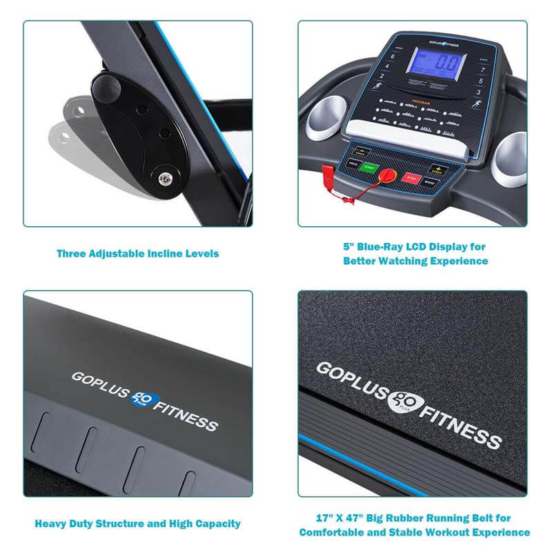 - Blue-Ray LCD Display and Rubber Running Belt: Features with 5" blue-ray LCD display that shows Time, Distance, Calories, Speed, Pulse, and Incline for providing a better watching experience. 17" x 47" big rubber running belt provides a comfortable and stable workout experience.
