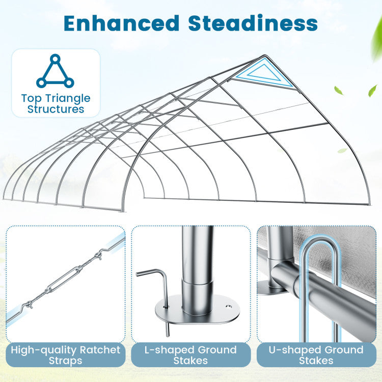 ● Enhanced Stability: This wedding tent is equipped with L-shaped ground stakes and U-shaped ground stakes, which can stand stably and give you peace of mind. Additionally, the top triangle construction, high-quality ratchet straps, elastic ball straps, and hook-and-loop fasteners provide extra stability.