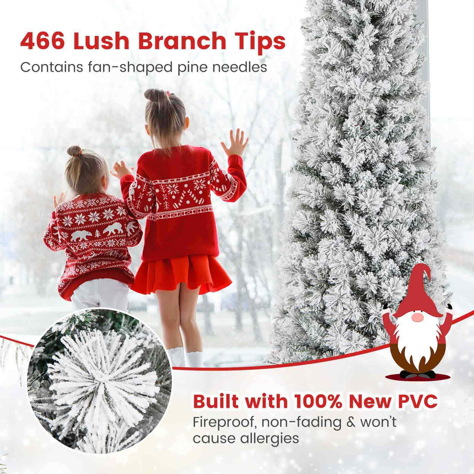 Its slim design, adorned with 466 flourishing branch tips, infuses your space with the vivacity of real trees while maintaining ample floor space. Revel in the tender glow emitted by up to 210 warm white LED lights, which will make your room full of loving glow. The Xmas tree seamlessly blends fan-shaped pine needles & lifelike PVC leaves, artfully replicating the natural charm of real trees. Crafted from 100% new PVC, it seamlessly withstands fire, fading & allergies, ensuring longevity. Transport yourself to a snow-covered wonderland with the delicately flocked appearance. The tree effortlessly assembles & disassembles with 3 sections, complemented by a stable folding metal stand that safeguards your floors. For your protection, a pair of gloves is thoughtfully included.