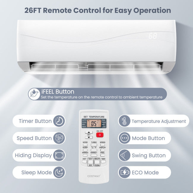 Easy Control and Quiet Operation: A convenient remote control allows you to conveniently control this mini split air conditioner unit from the comfort of your bed or sofa. Smart 0.5-24 hour timer and low noise operation ensure restful sleep time. What's more, after 10 seconds without any operation, the display on the remote control will automatically turn off without disturbing your sleep.