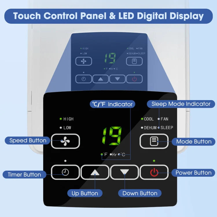 ● Easy Operation & Auto Swing: Equipped with a convenient remote control (2 AAA batteries included) and a smart touch control panel with LED digital display, you can easily adjust and check all settings. In addition, the louvers can be manually adjusted 60° left and right, and automatically swing up and down 120°, bringing coolness to every corner of the room.