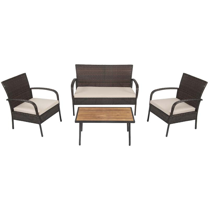 4 Pcs Rattan Patio Conversation Furniture Set Wicker Outdoor Sofa Set with Cushions & Acacia Wood Tabletop