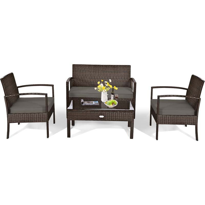 4 Pcs Wicker Patio Conversation Furniture Set Outdoor Rattan Sofa Set with Coffee Table & Washable Cushions