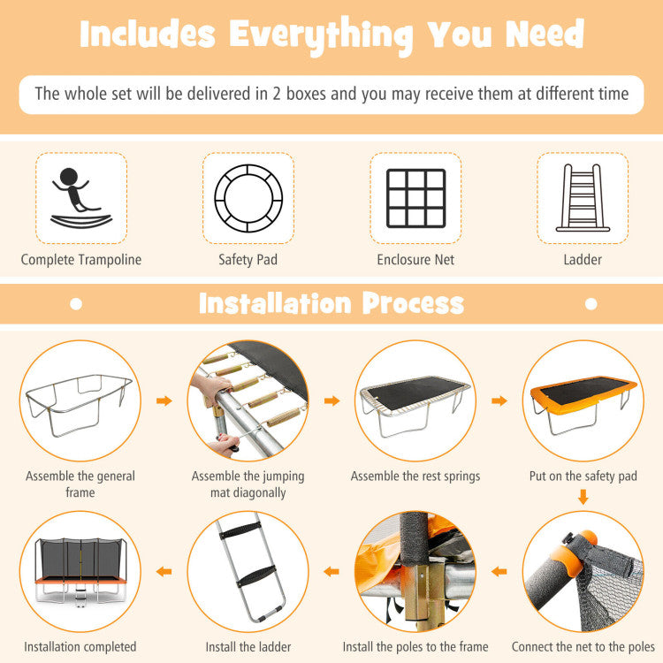 Easy Assembly and Delivery Information: This outdoor trampoline comes with all the accessories, installation instructions and tools you need. The pole can be easily installed using the locking pin, no tools required. The entire trampoline set will be delivered in 2 boxes and you may receive them at different times.