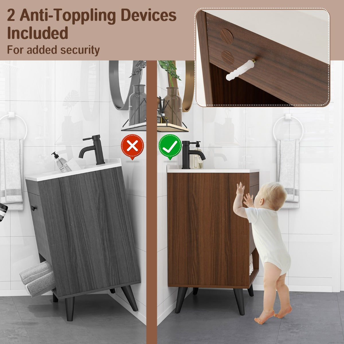 - Modern Style and Safe Design: 2 anti-toppling devices are included in the package for added security, which is safe for families with kids and pets. The simple and elegant look fits easily with any bathroom decoration style.Â