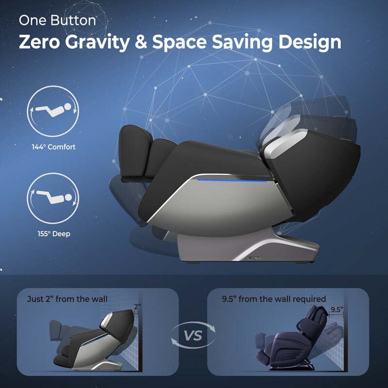 - Zero Gravity & Space-saving Design: The massage chair has 2 zero gravity positions, which will switch your posture to where your calf is above your heart for a weightless relaxing experience. And the space-saving technology is only 2 inches from the wall. TFT color screen remote control, LED mood lights, USB charging port, adjustable timer for maximum convenience.