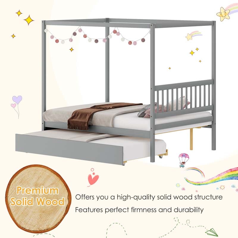 - Solid Wood Construction: Supported by solid wood structure, the canopy bed performs excellent sturdiness, improving the full bed's load capacity up to 600 lbs and trundle's up to 200 lbs. Also, many plywood slats locate evenly to highly reduce the noise generated by turning over.