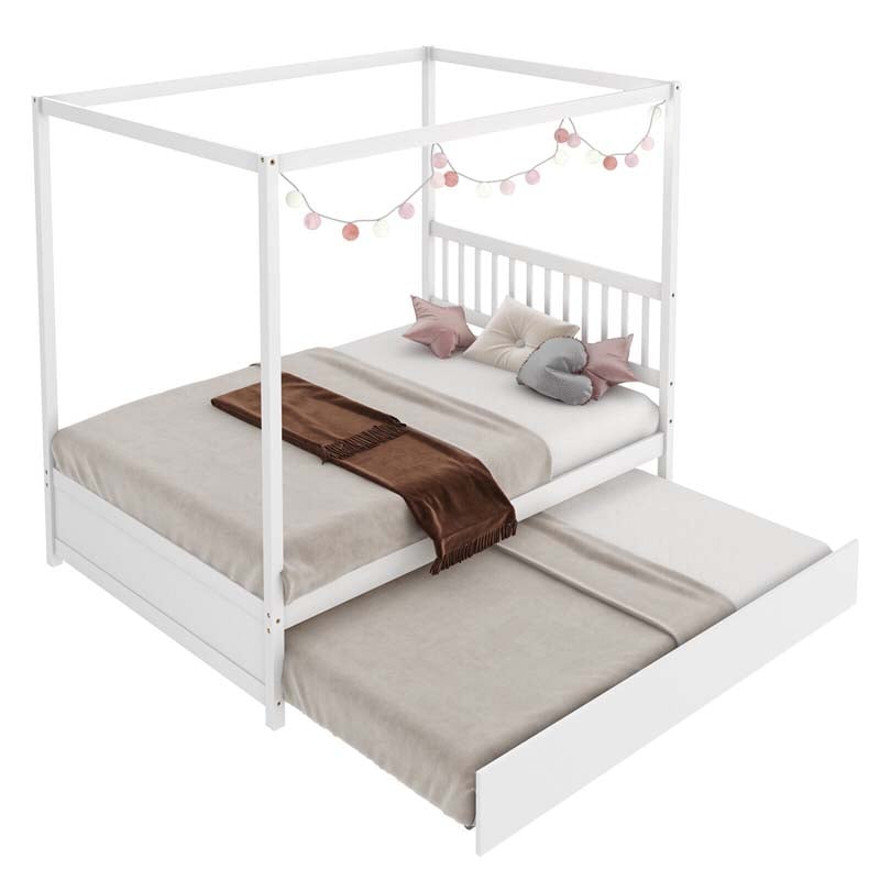 - Adorable Canopy Bed: The canopy bed with trundle is designed with a canopy frame, acting like a protector for sleeping children. Meanwhile, there are four canopy rails in total where parents can hang colorful flags, ribbons, lanterns and lights to build a distinctive child bedroom.