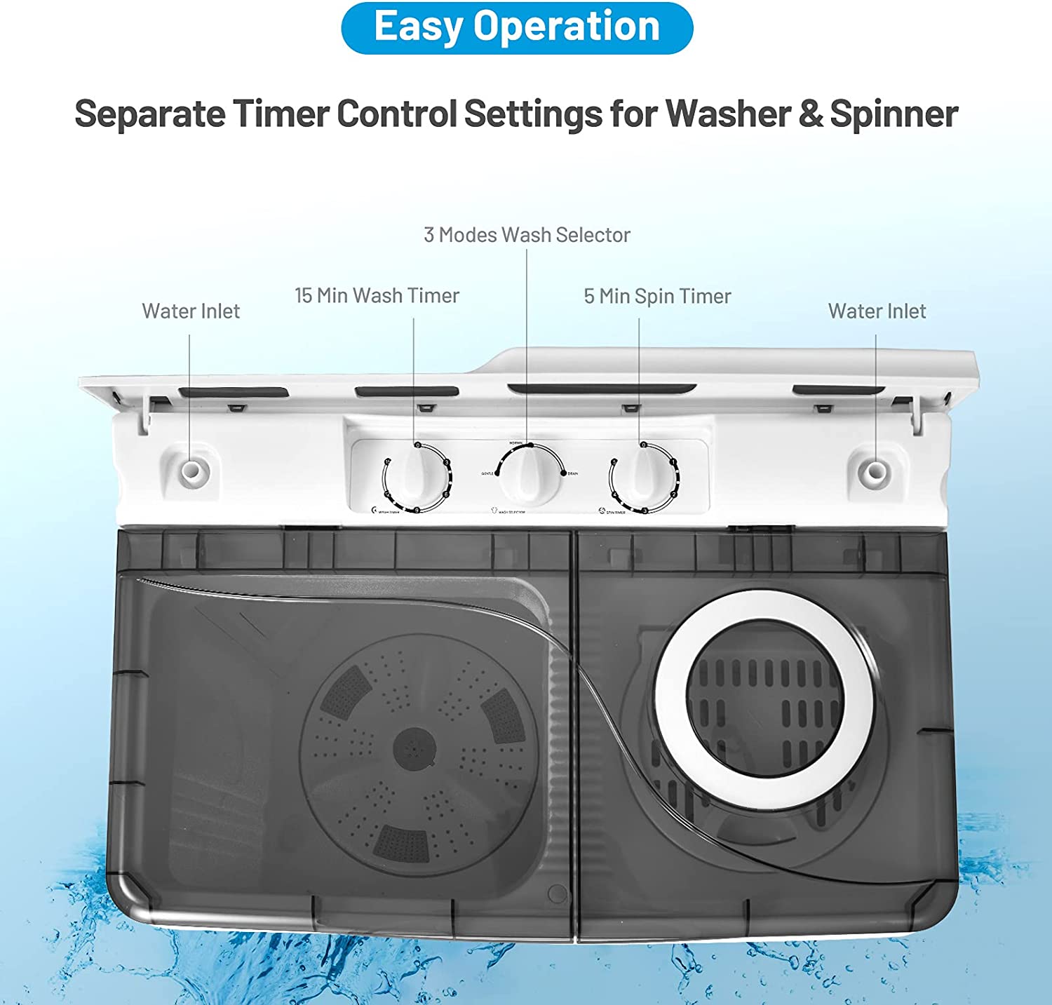 Large Capacity Twin Tub Washing Machine: This portable washing machine has a dual function with two tubs, allowing you to wash and dry your clothes at the same time. It's a good choice to free your hands and save time. Besides, its compact, lightweight design makes it easy to install in a bathroom or closet.